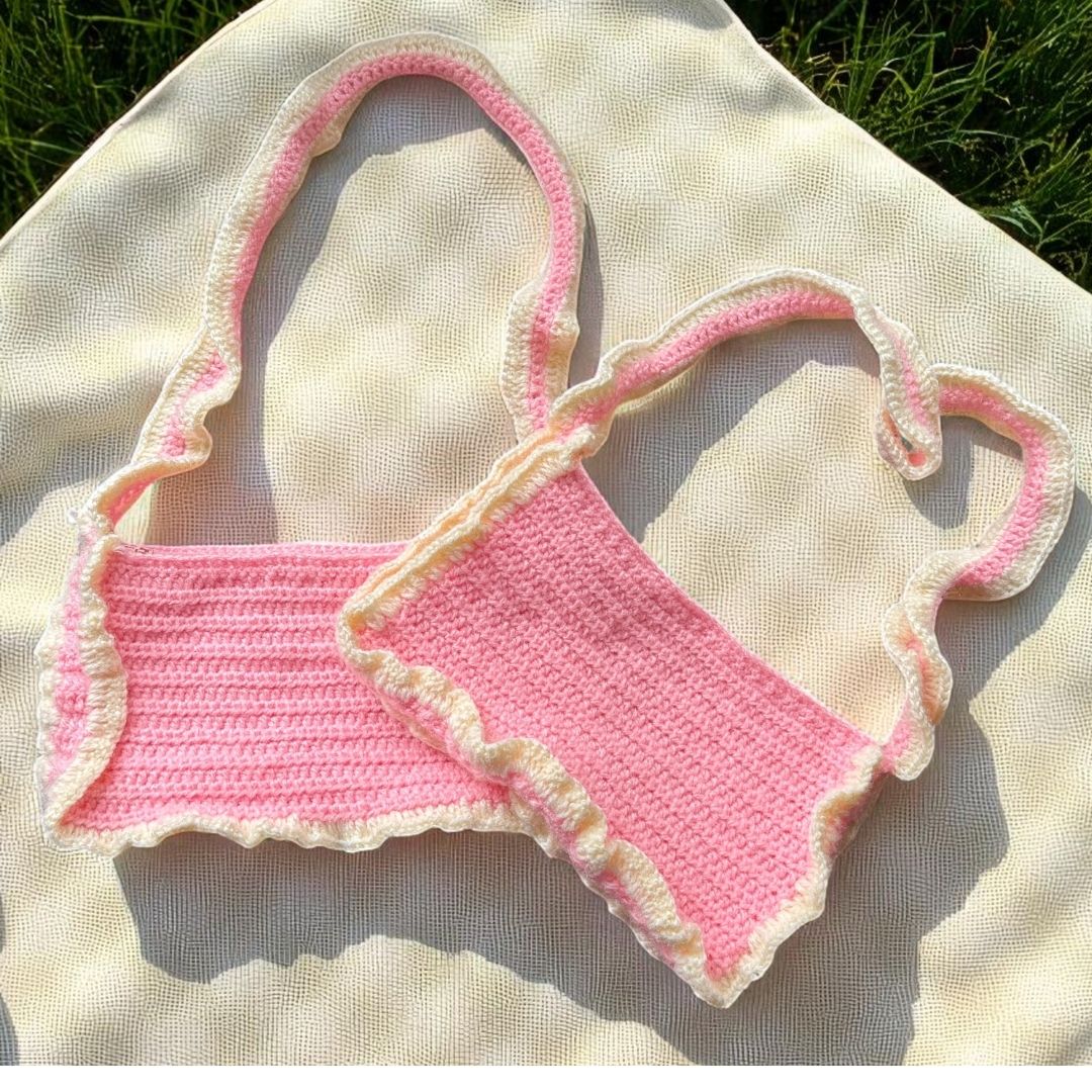 Delicately hand-crocheted in pastel pink with cream ruffle borders, this bag brings a soft vintage charm to your everyday look.