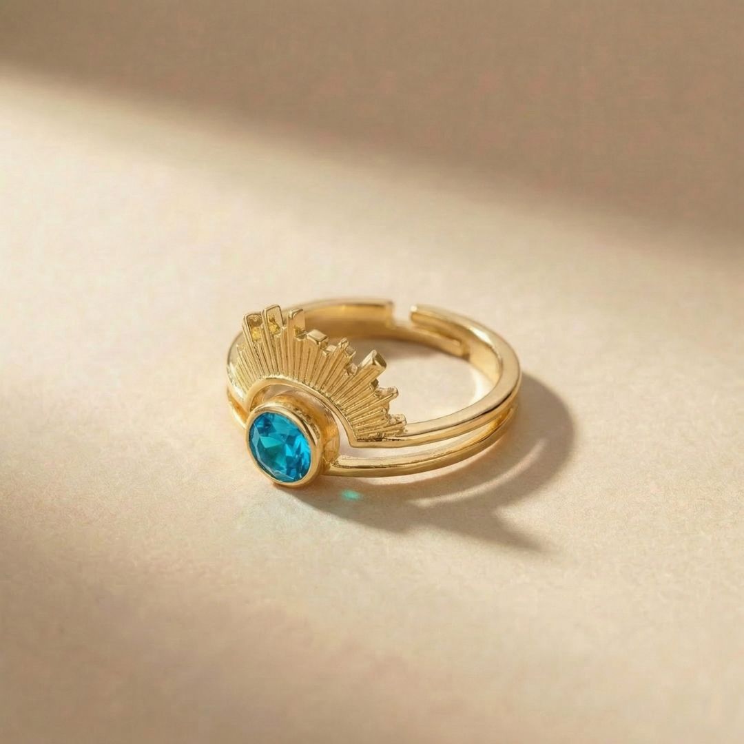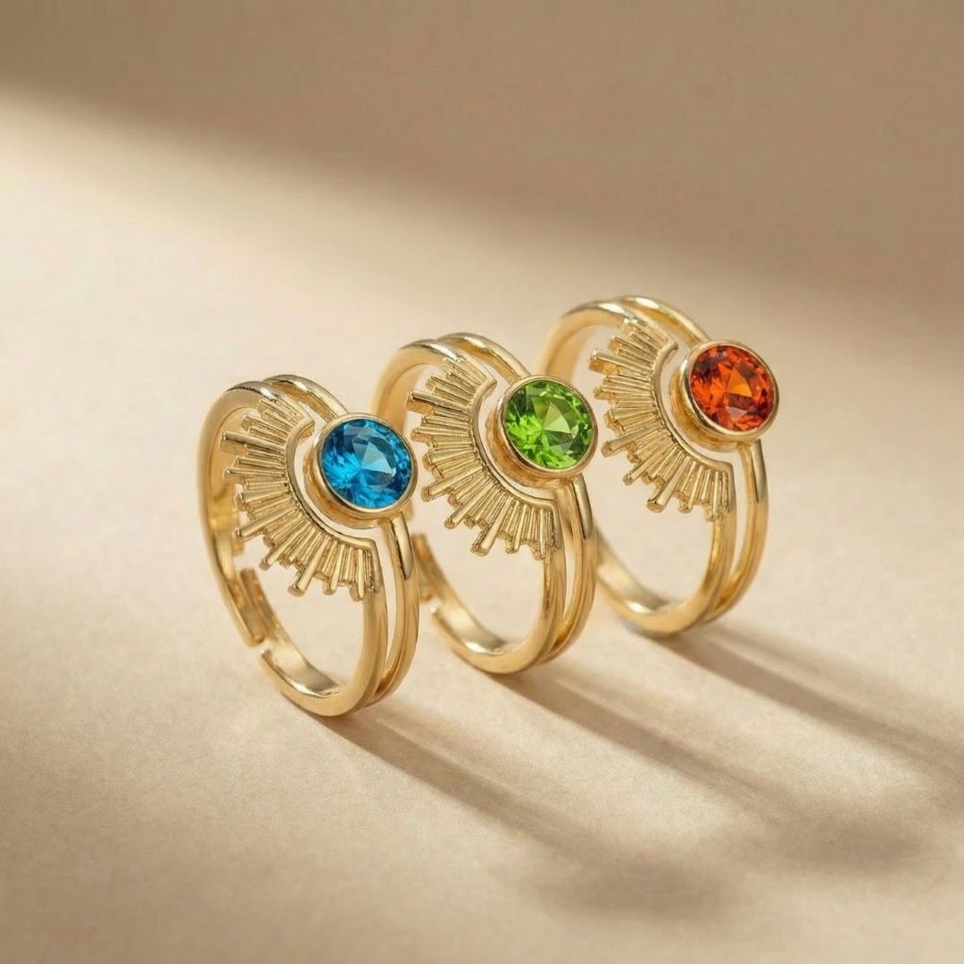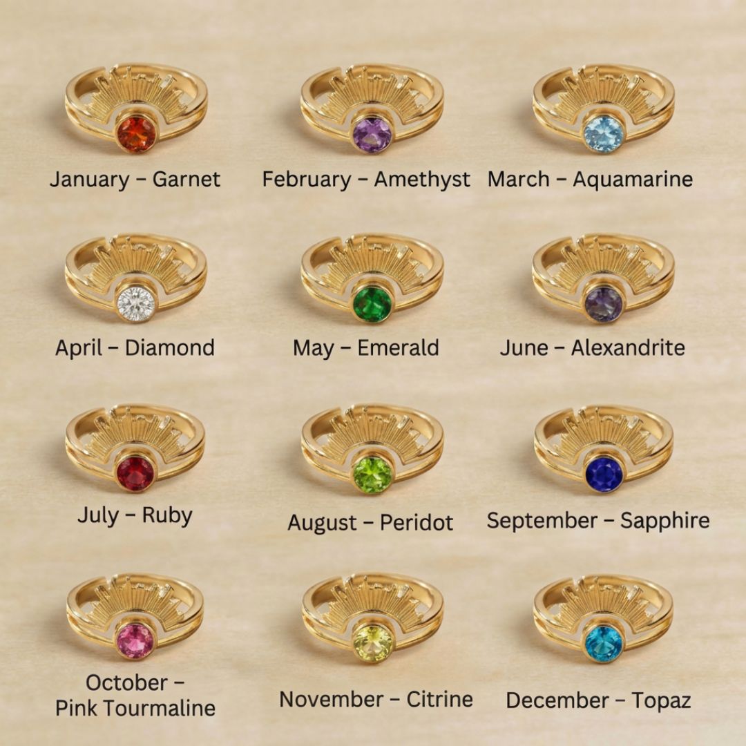 At its center is a birthstone of your choice, surrounded by a sun-inspired halo that represents strength, warmth, and confidence. Finished in elegant gold, it’s designed to shine effortlessly every day.