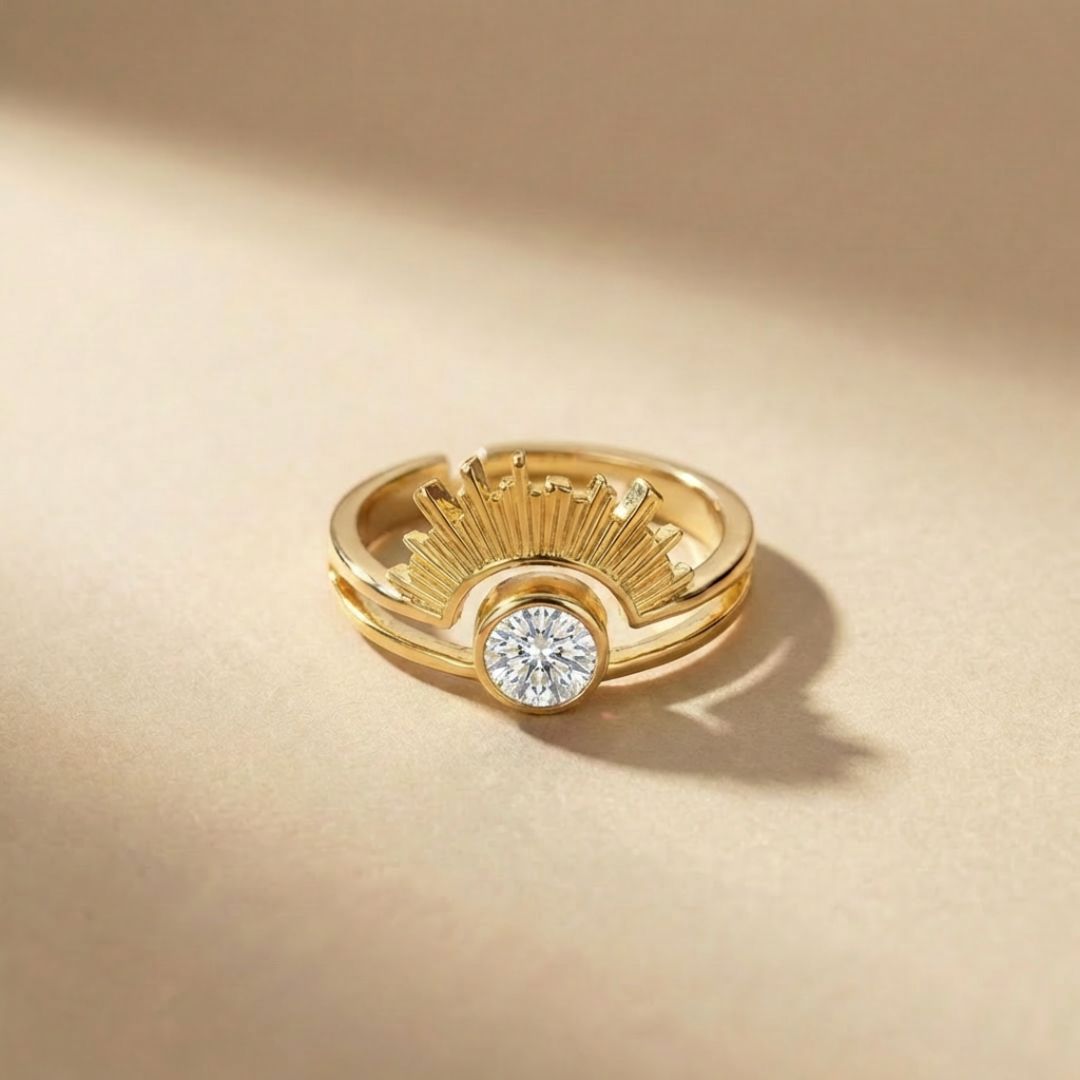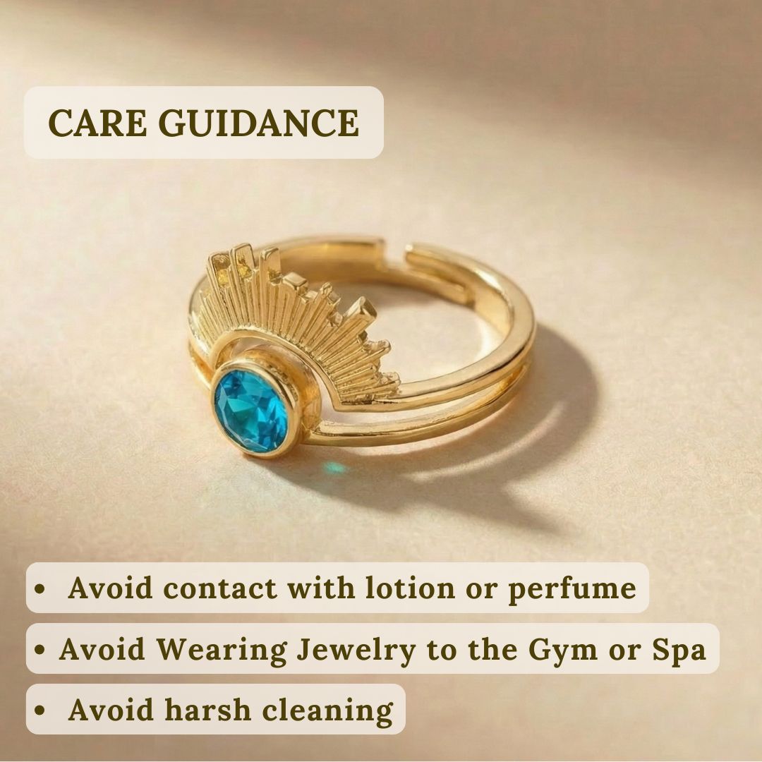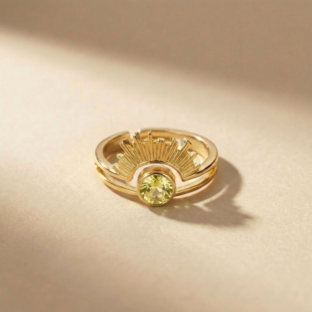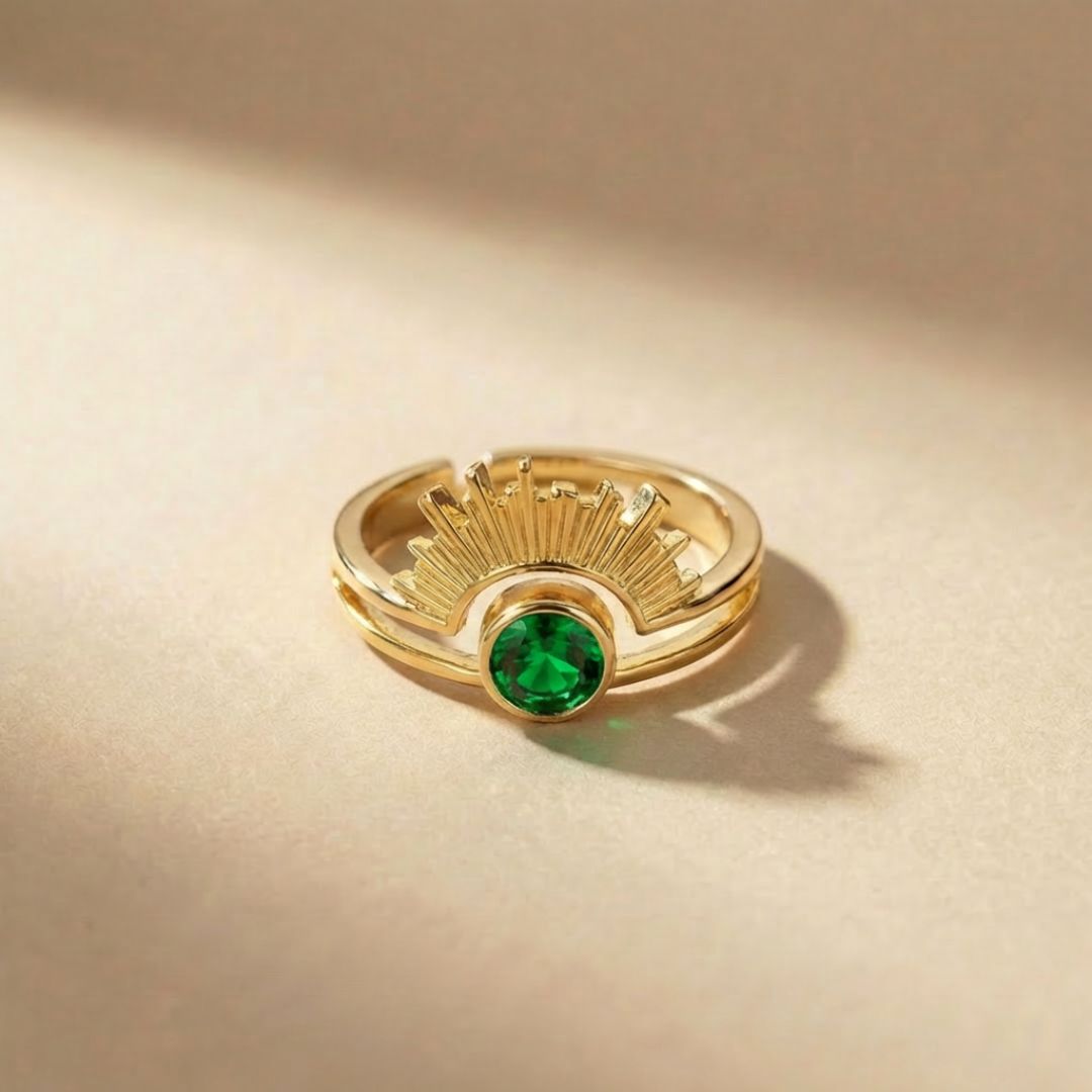 At its center is a birthstone of your choice, surrounded by a sun-inspired halo that represents strength, warmth, and confidence. Finished in elegant gold, it’s designed to shine effortlessly every day.
