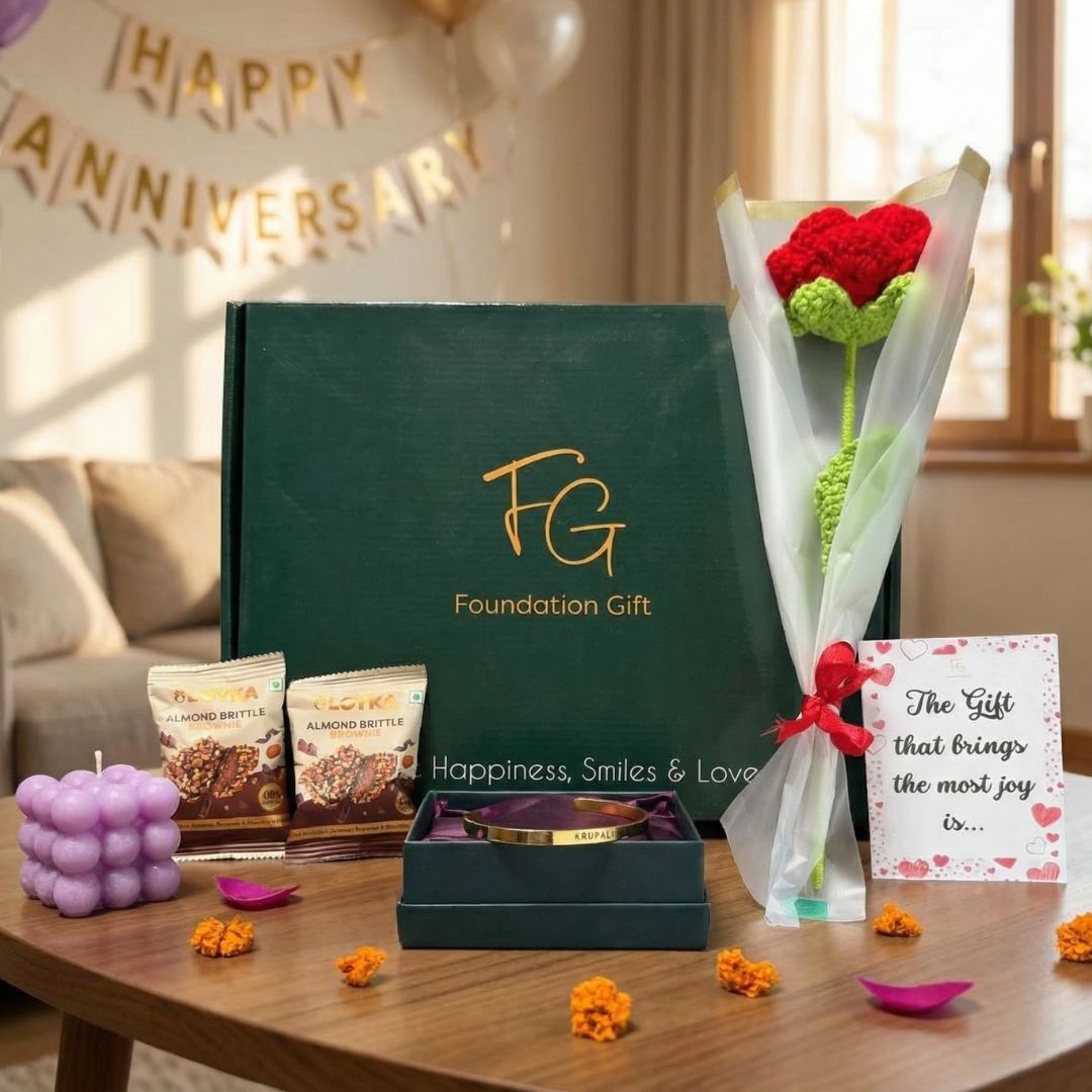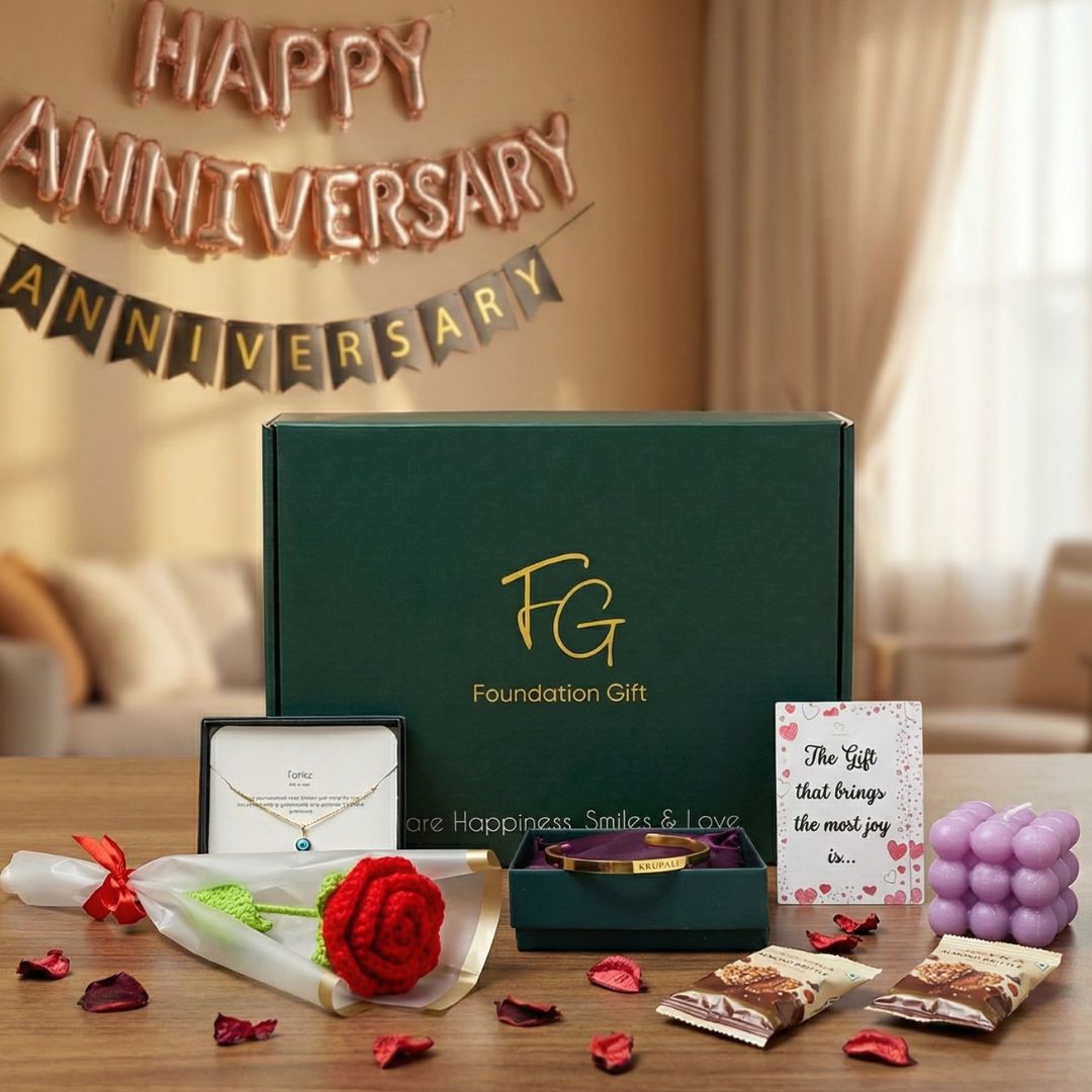 A grand celebration of love — with a personalised bracelet, Birthstone necklace, crochet rose, premium chocolates, and a luxury candle, along with Bling sling bag, all packed in a premium gift box.