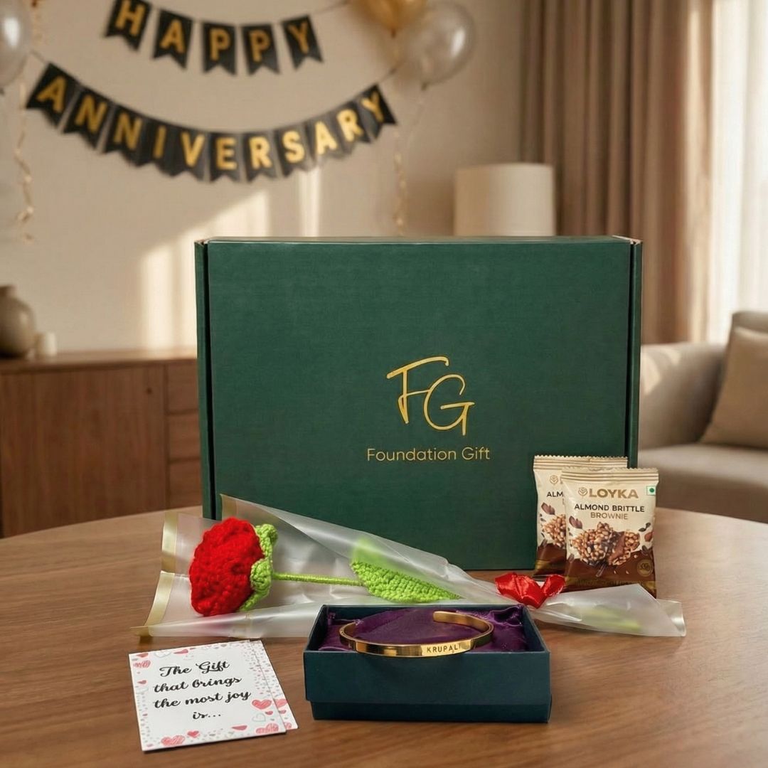 A thoughtful trio of a personalised bracelet, a crochet rose, and premium chocolates — the perfect way to make her feel truly special.