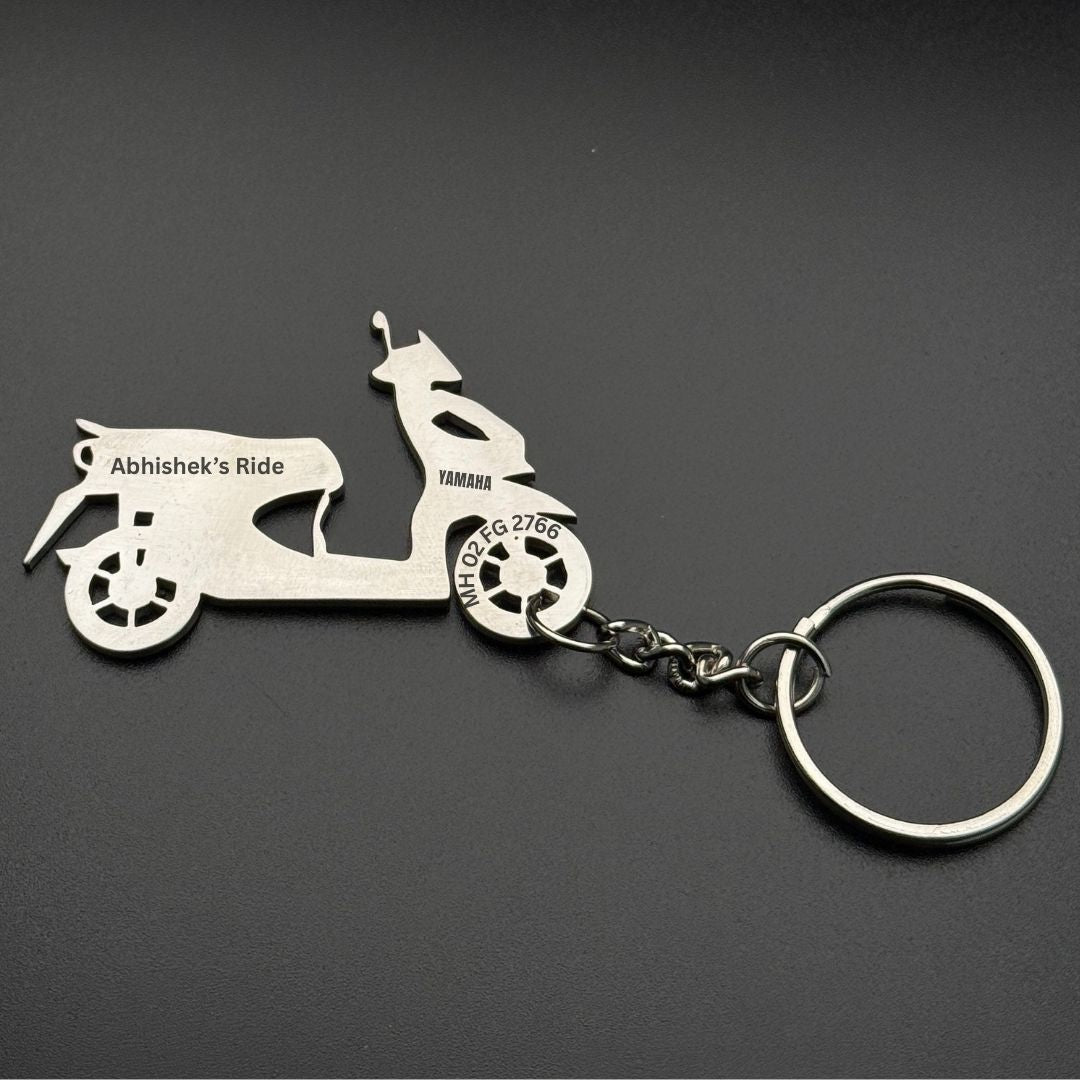 A sleek, customised keychain made especially for Yamaha Ray riders — with their name or number engraved on it.